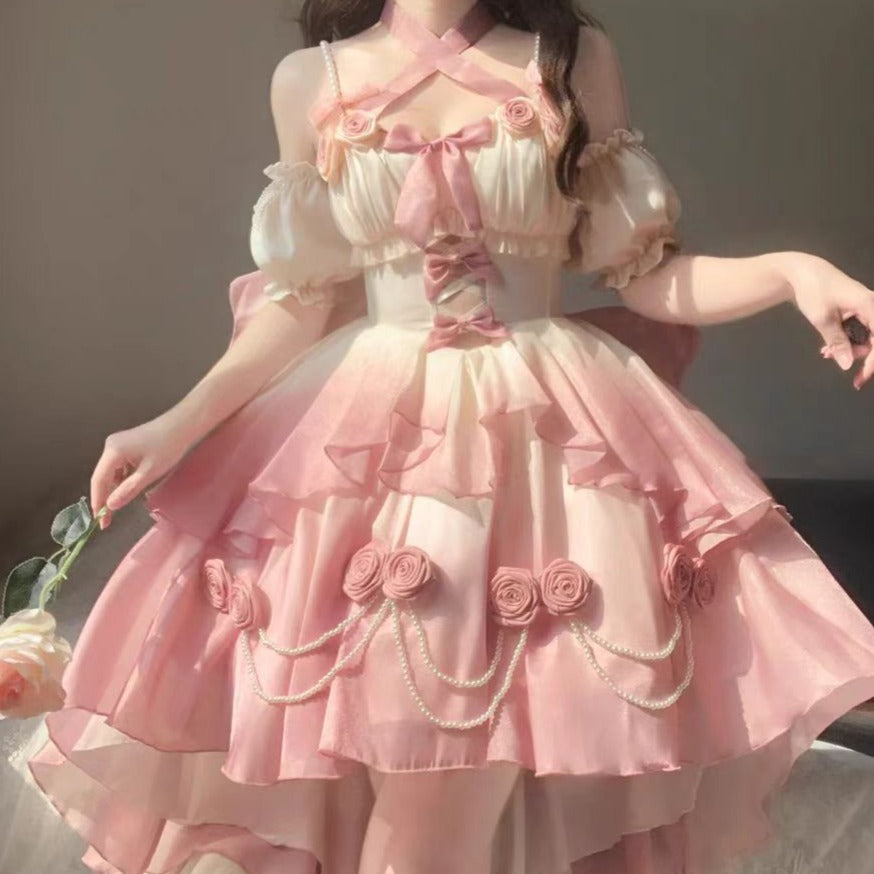 Elsa Lolita Love Goddess PInk Blue Gradient Rose Fairy Prom Dress