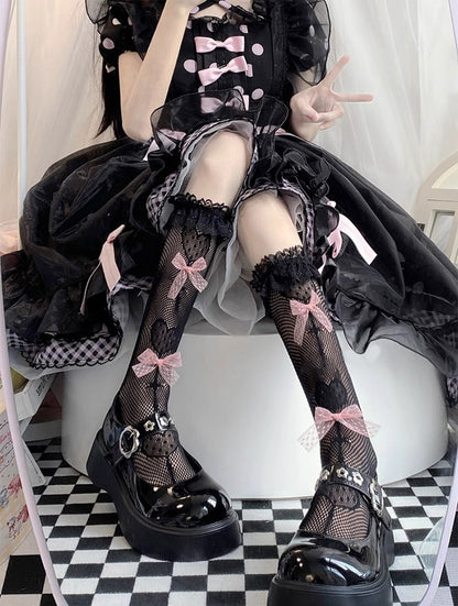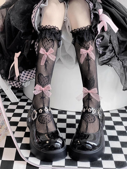 Heart Cross Pink Bow Lace Black White Calf Socks