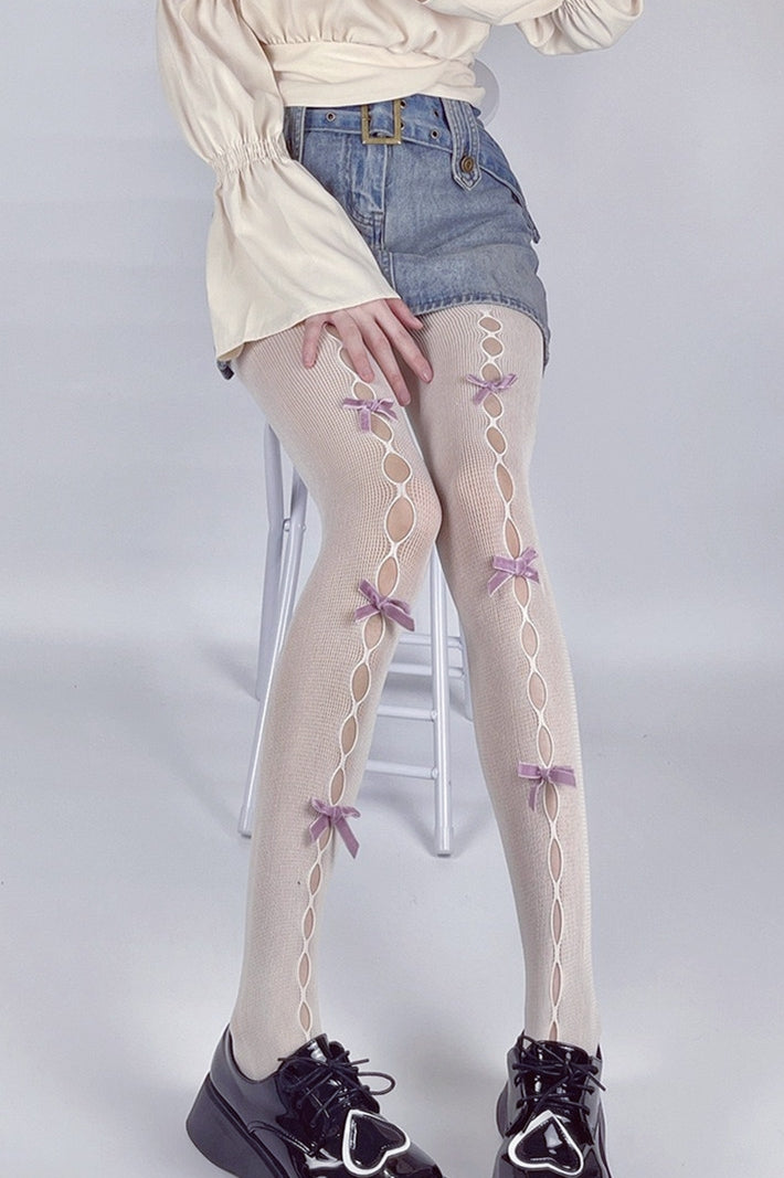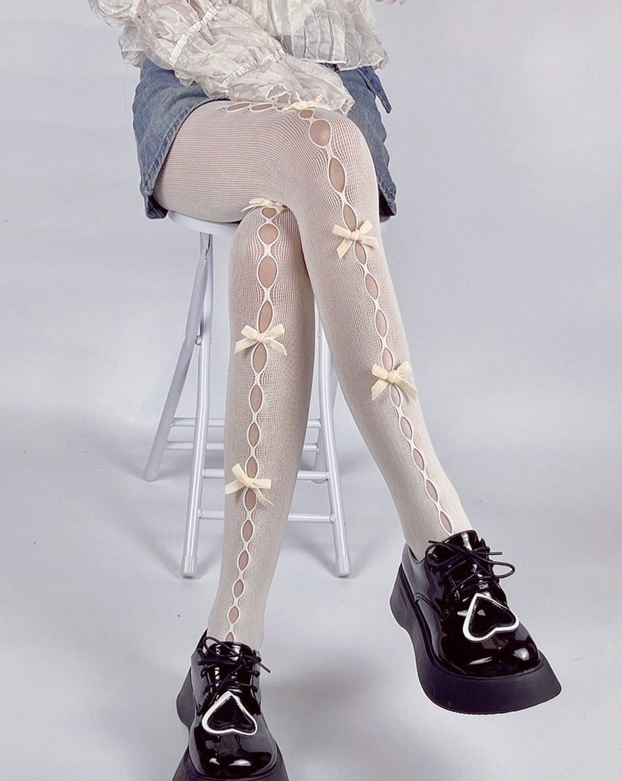 Dress up your legs with Lolita Bow Lace Tights! Featuring a cute velvet bow and delicate fishnet material, these tights add a sweet touch to any outfit. Available in various colors with a hollow hole design and soft ribbons for added cuteness.