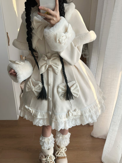 The Thousands Bows Winter Overcoat Cape Set combines cute pastel colors and warmth for the perfect winter look. Available in pink, mint green, and white, this woolen overcoat-dress is adorned with matching bow pins, fur collars, and cuffs. Button it up as a dress or wear it open for a chic layered look. Comes with a matching cape for extra warmth and style.