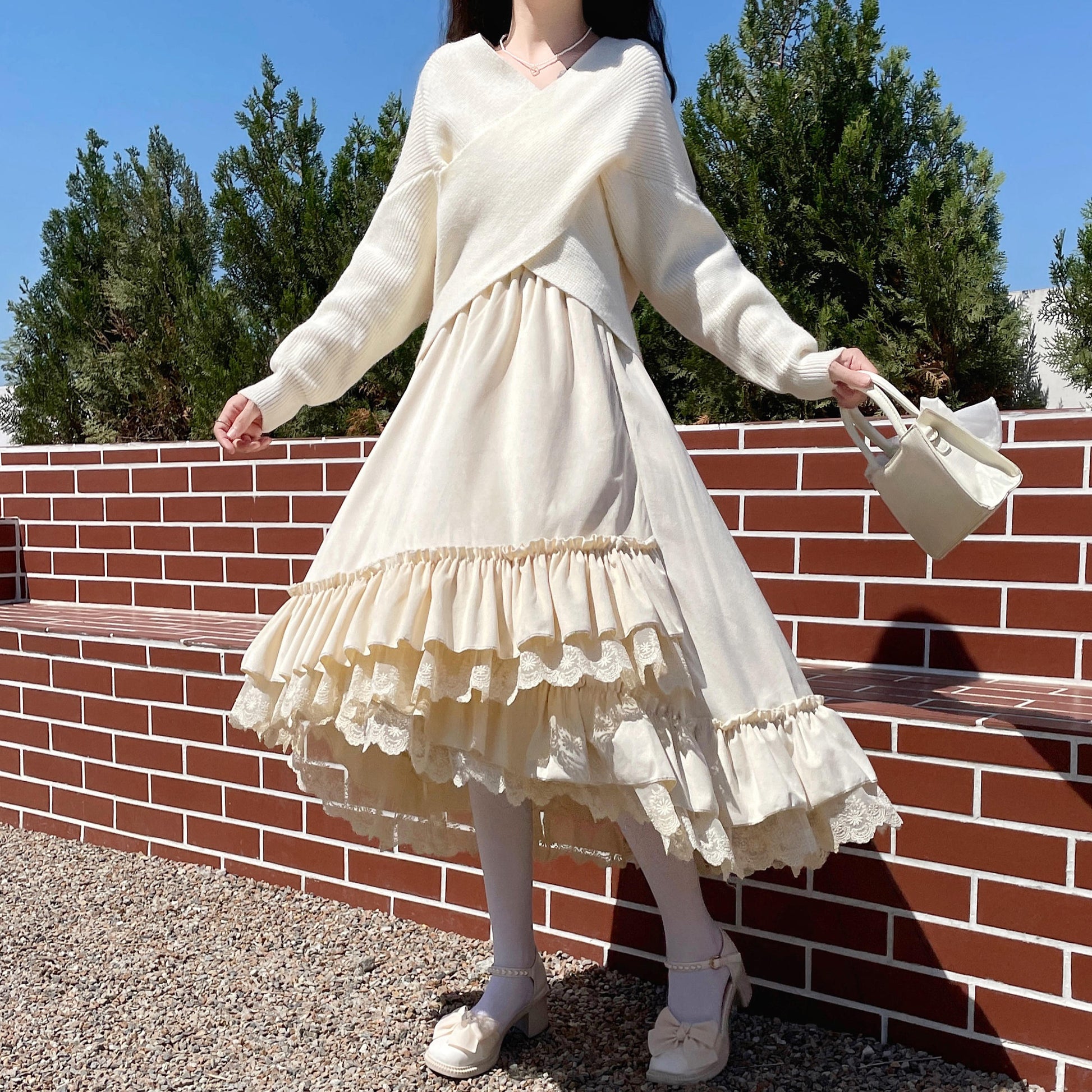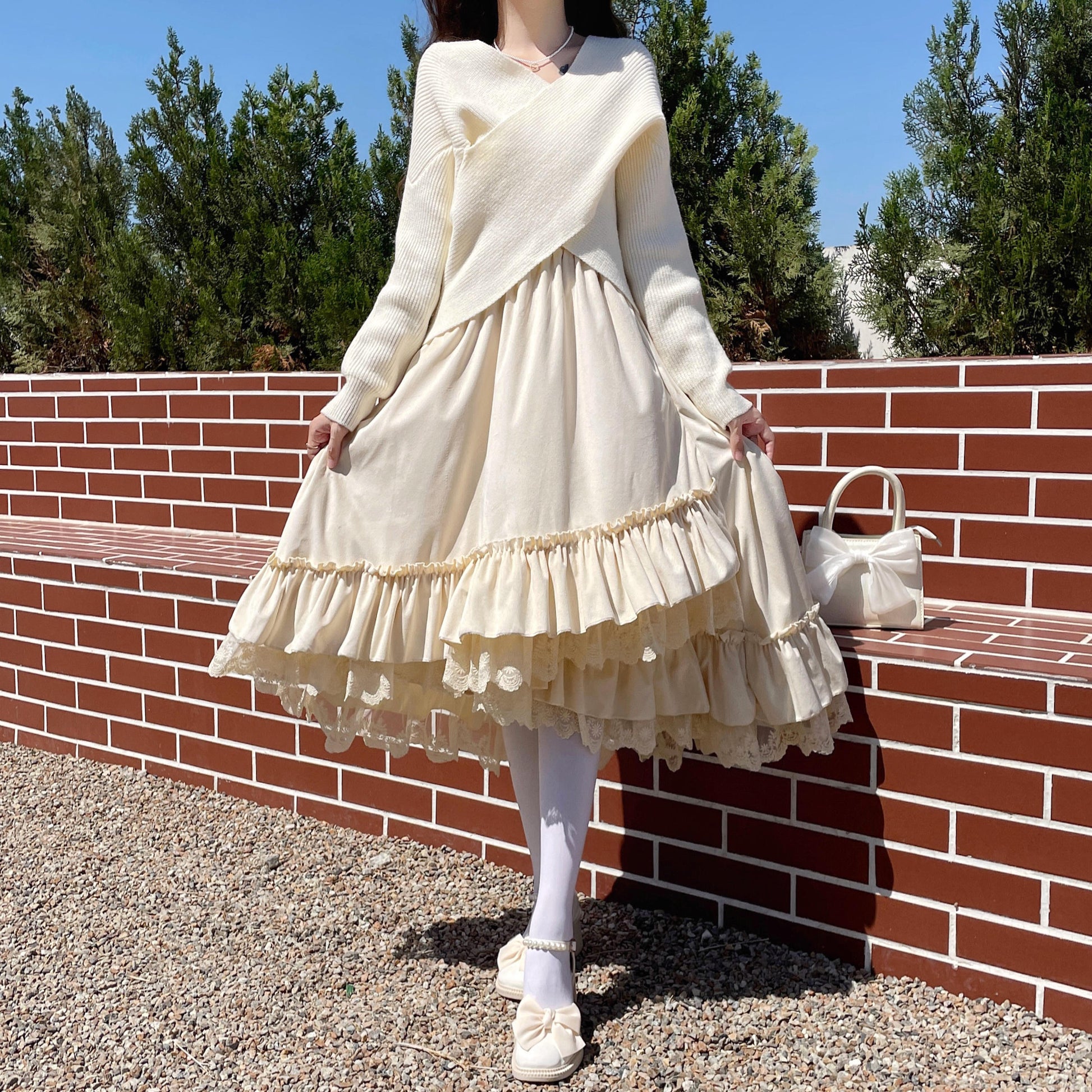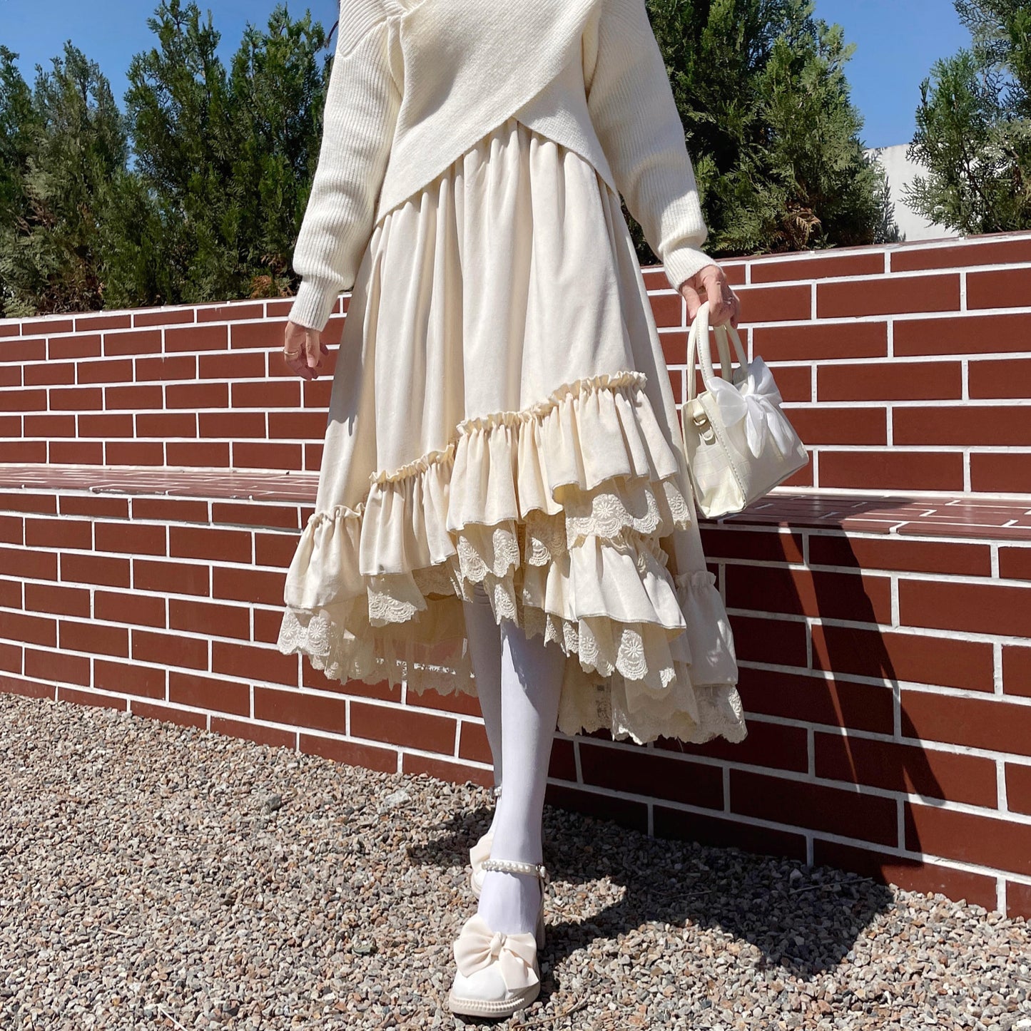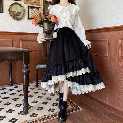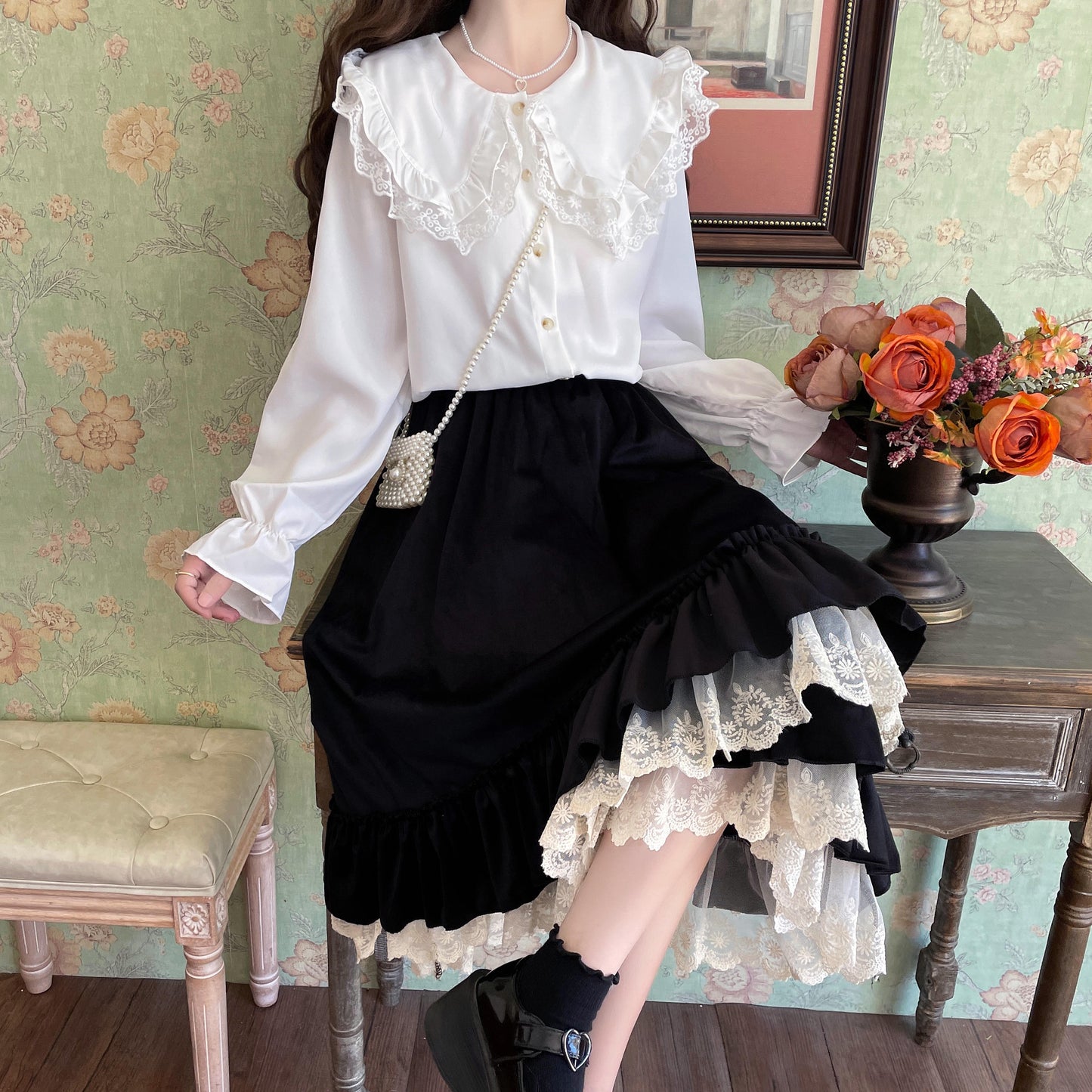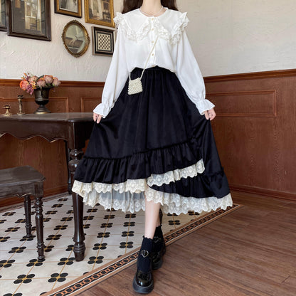 Mori Girl Fall Velvet White & Black Lace Long Elastic Gathered Waist Skirt