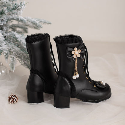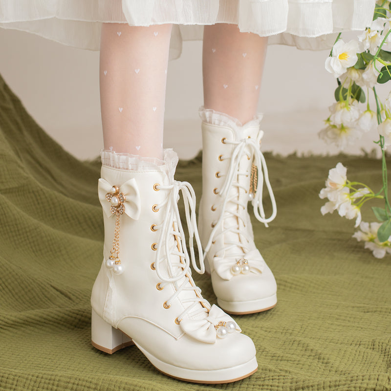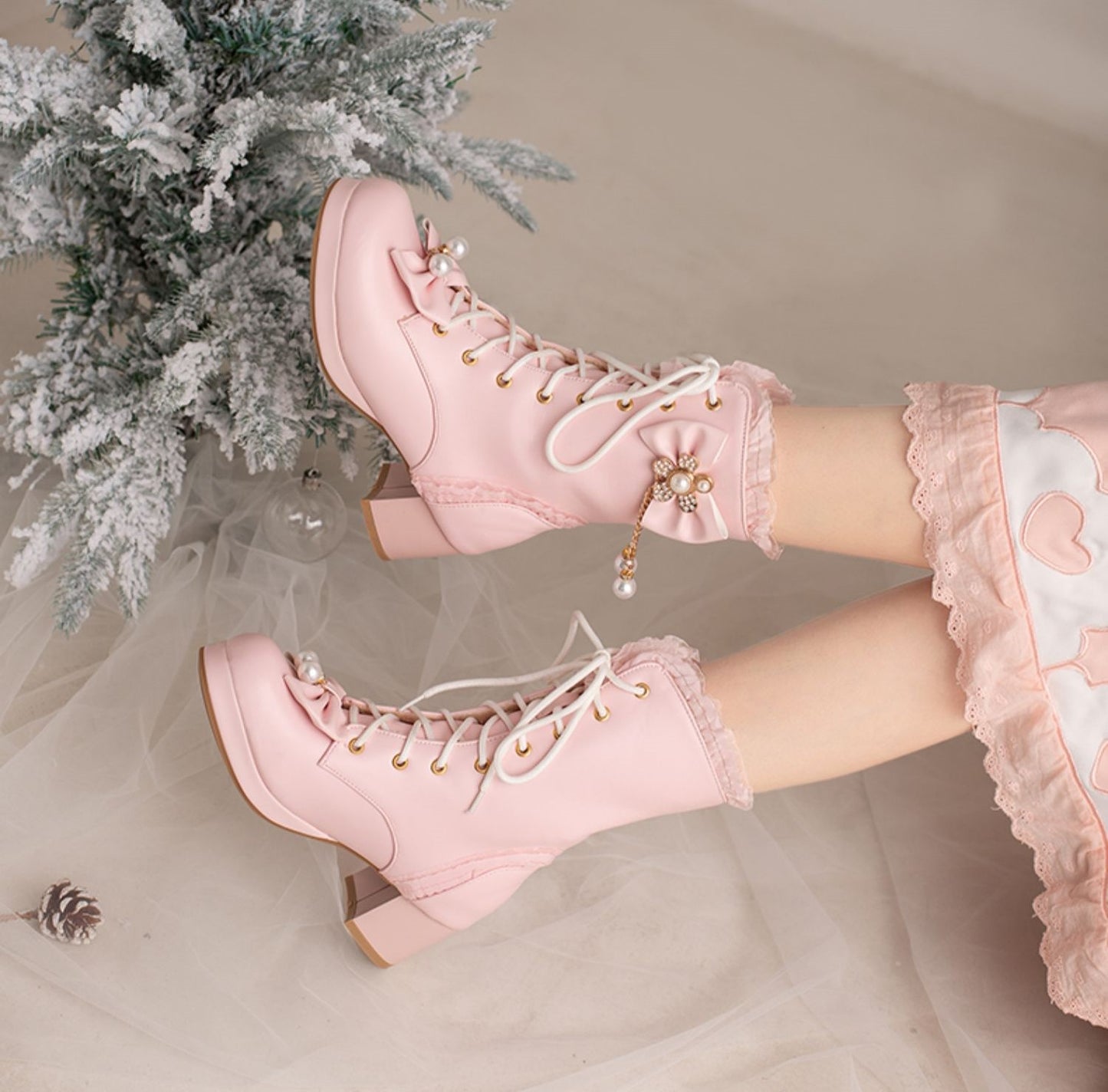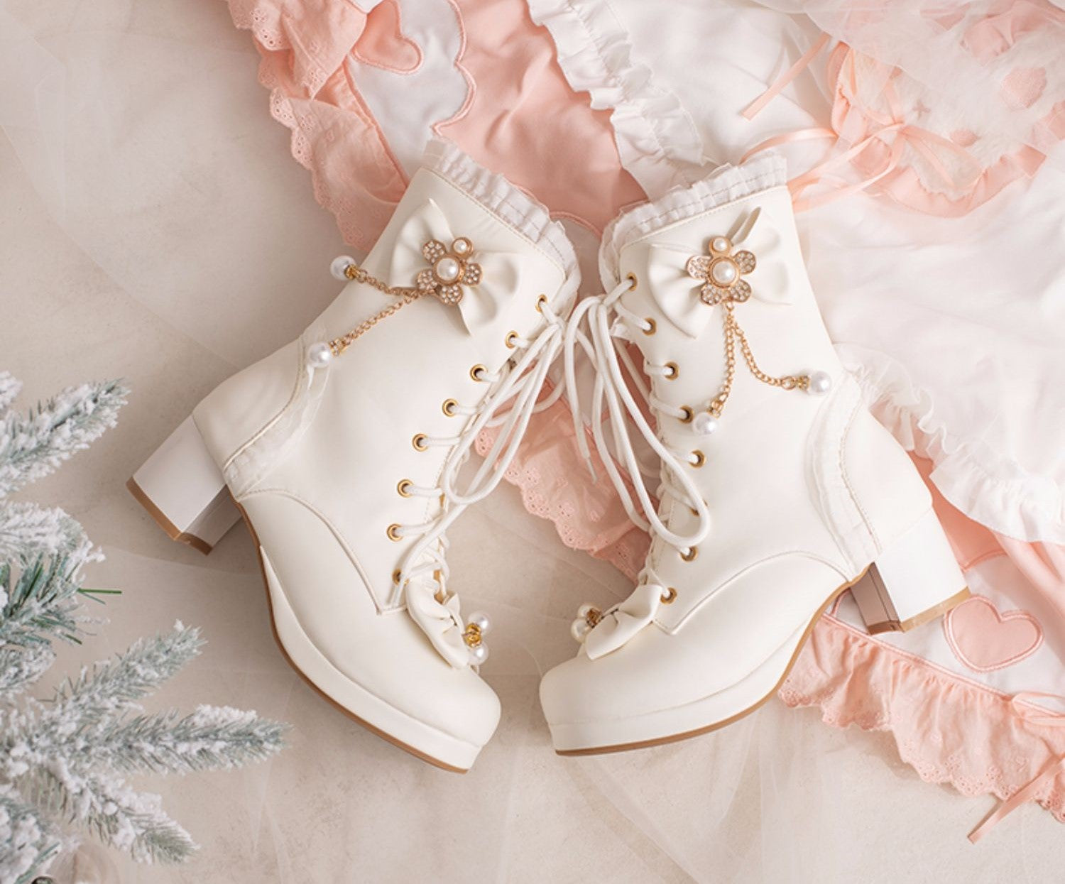 Princess Gold Diamond Chains Bow Black White Pink High Heels Shoes Boots
