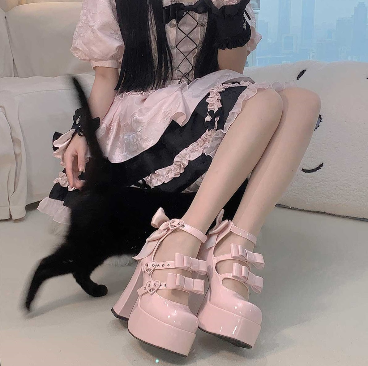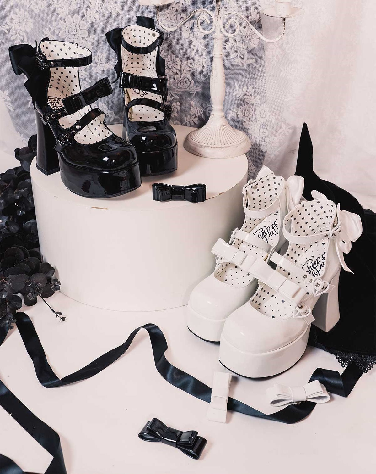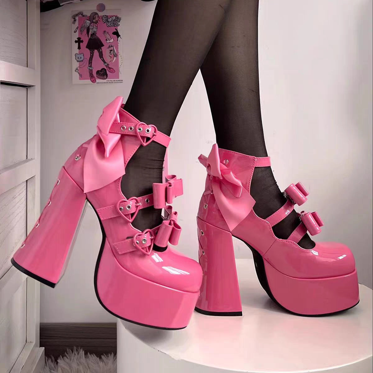 Puffy Sheep Heart Cross Bow Classic Platform Bow High Heels Shoes