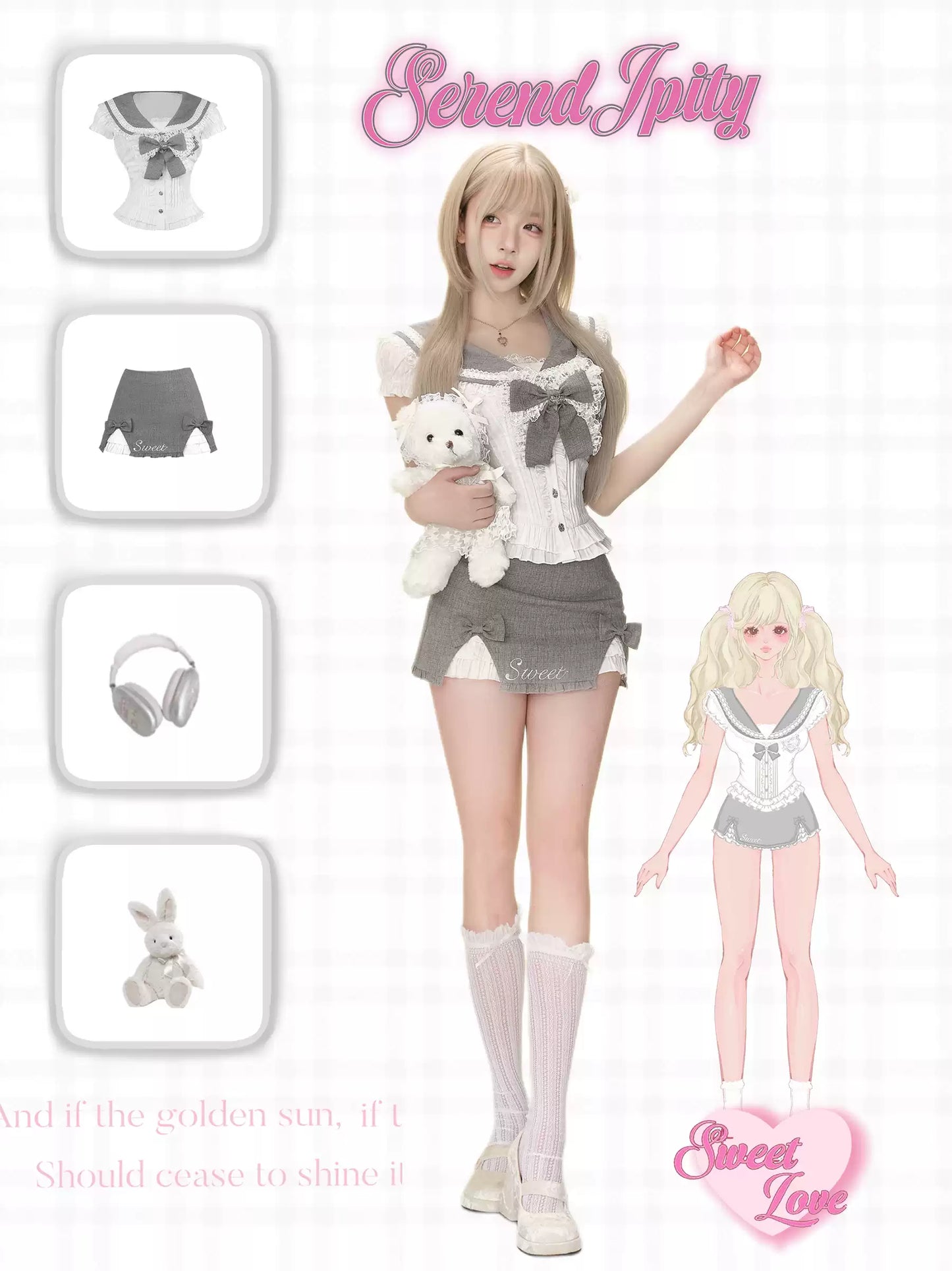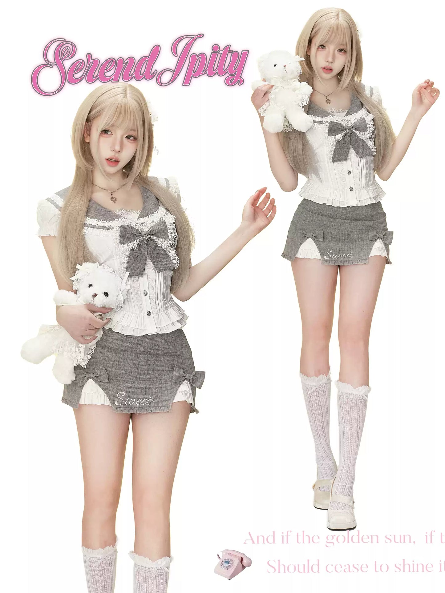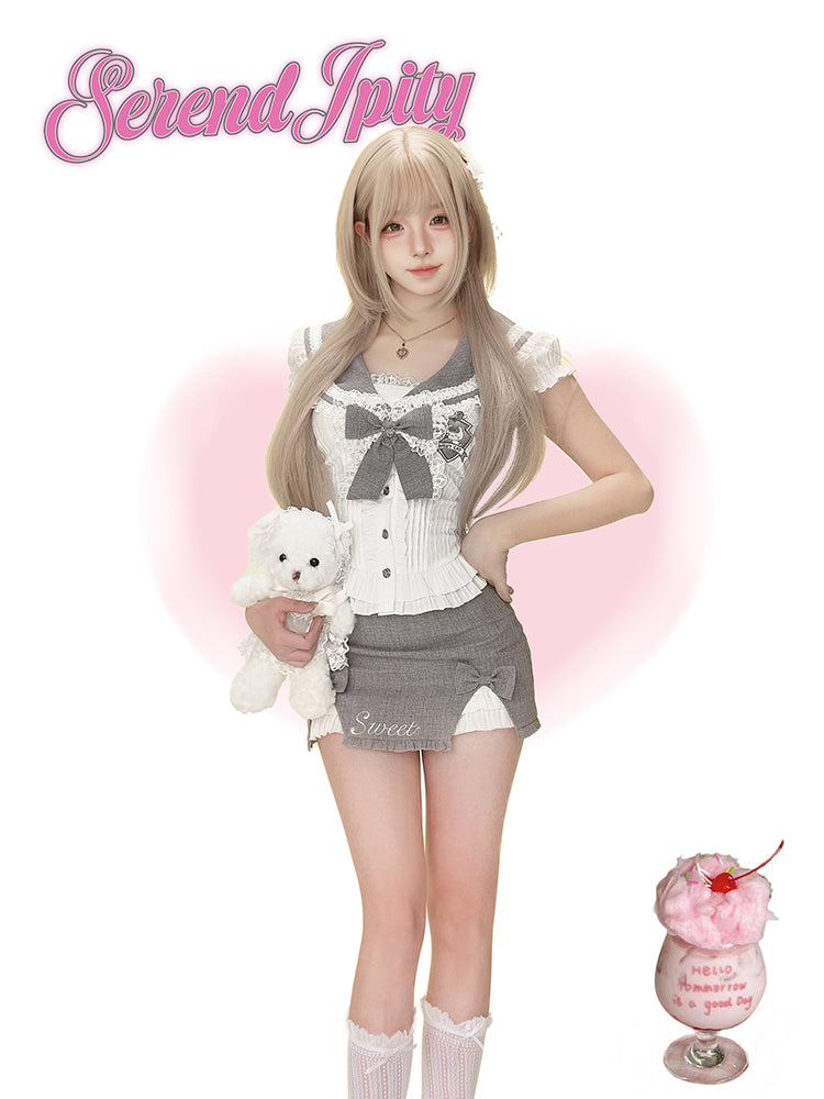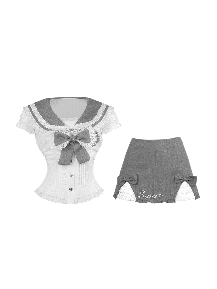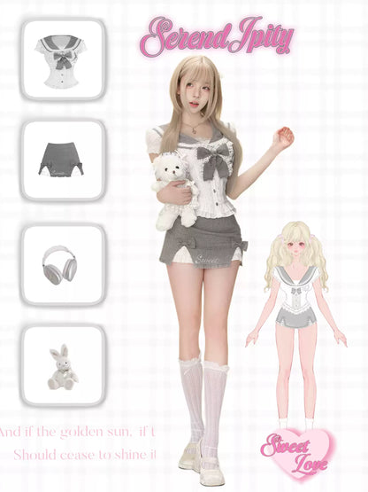 Serendipity College Dep Sugar Cream Gray Sailor Top & Skirt Two Piece Set