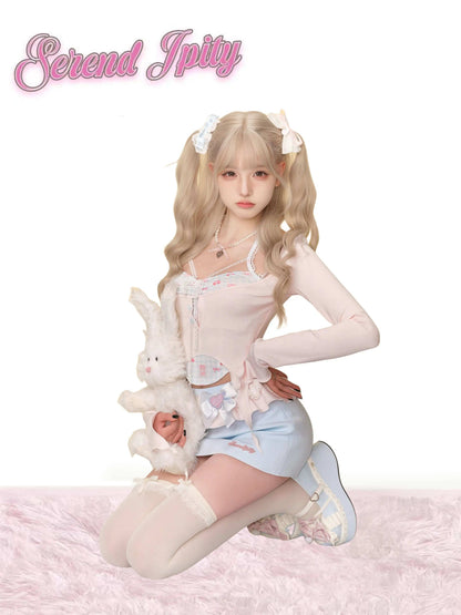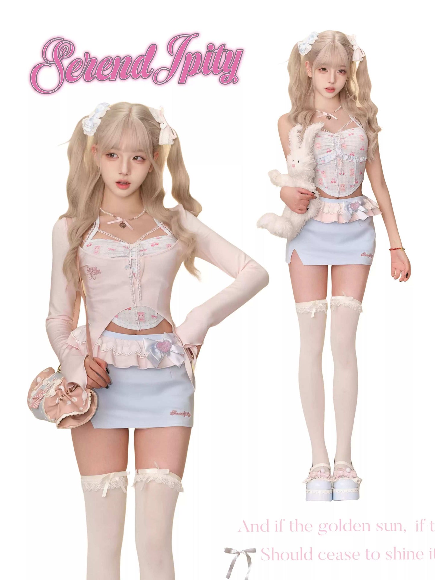 Serendipity Dessert Series Candy Doll Blue Cami & Skirt & Pink Cardigan Three Piece Set