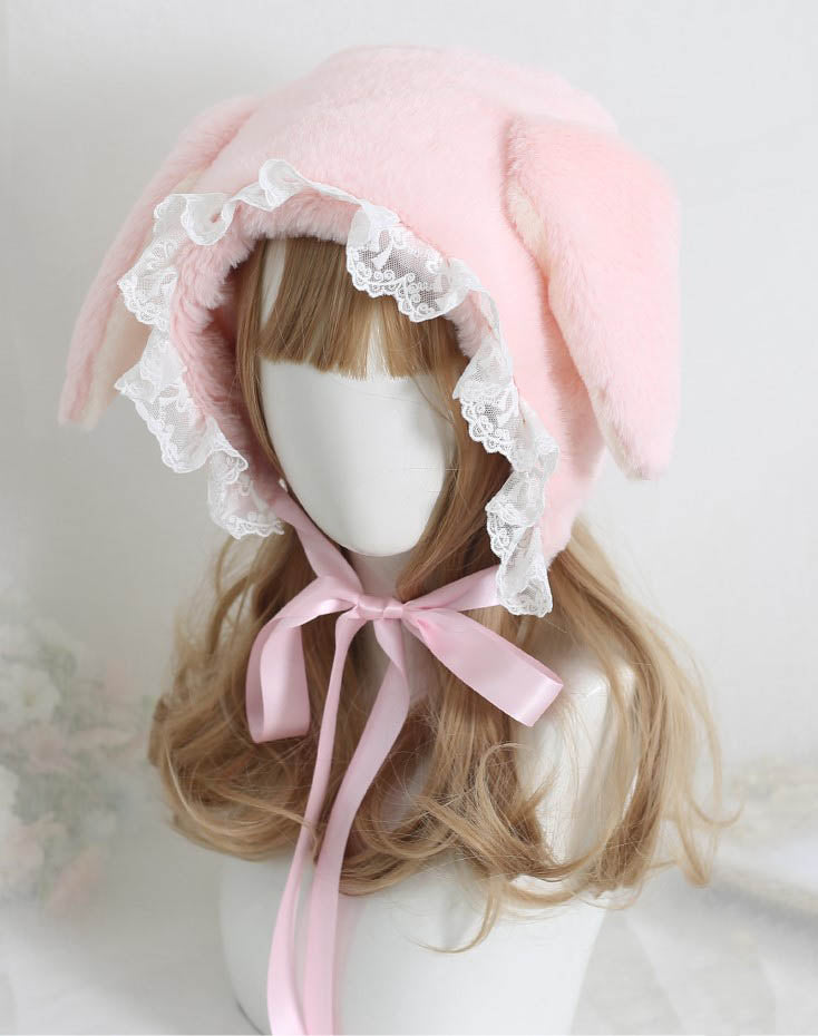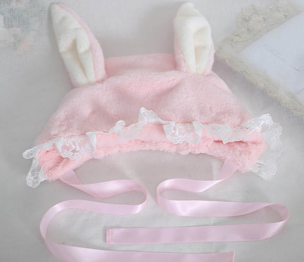 Sweet Rabbit Ear Pink & White Lace Lolita Handmade Fur Hats