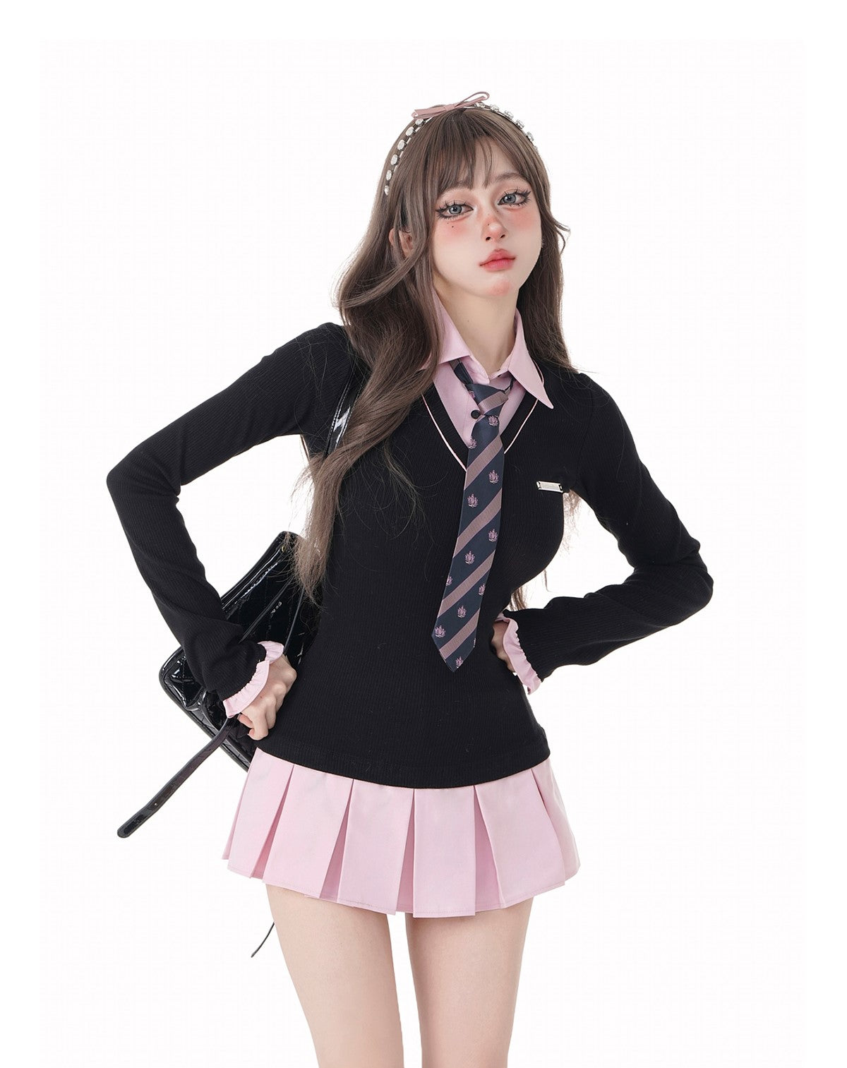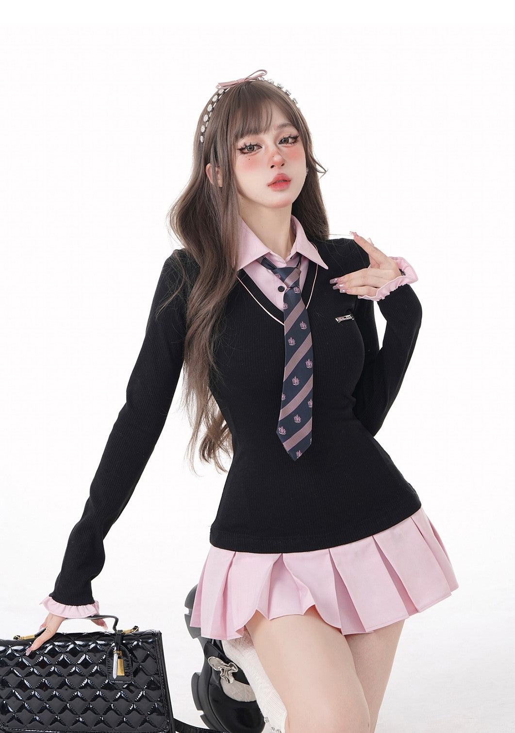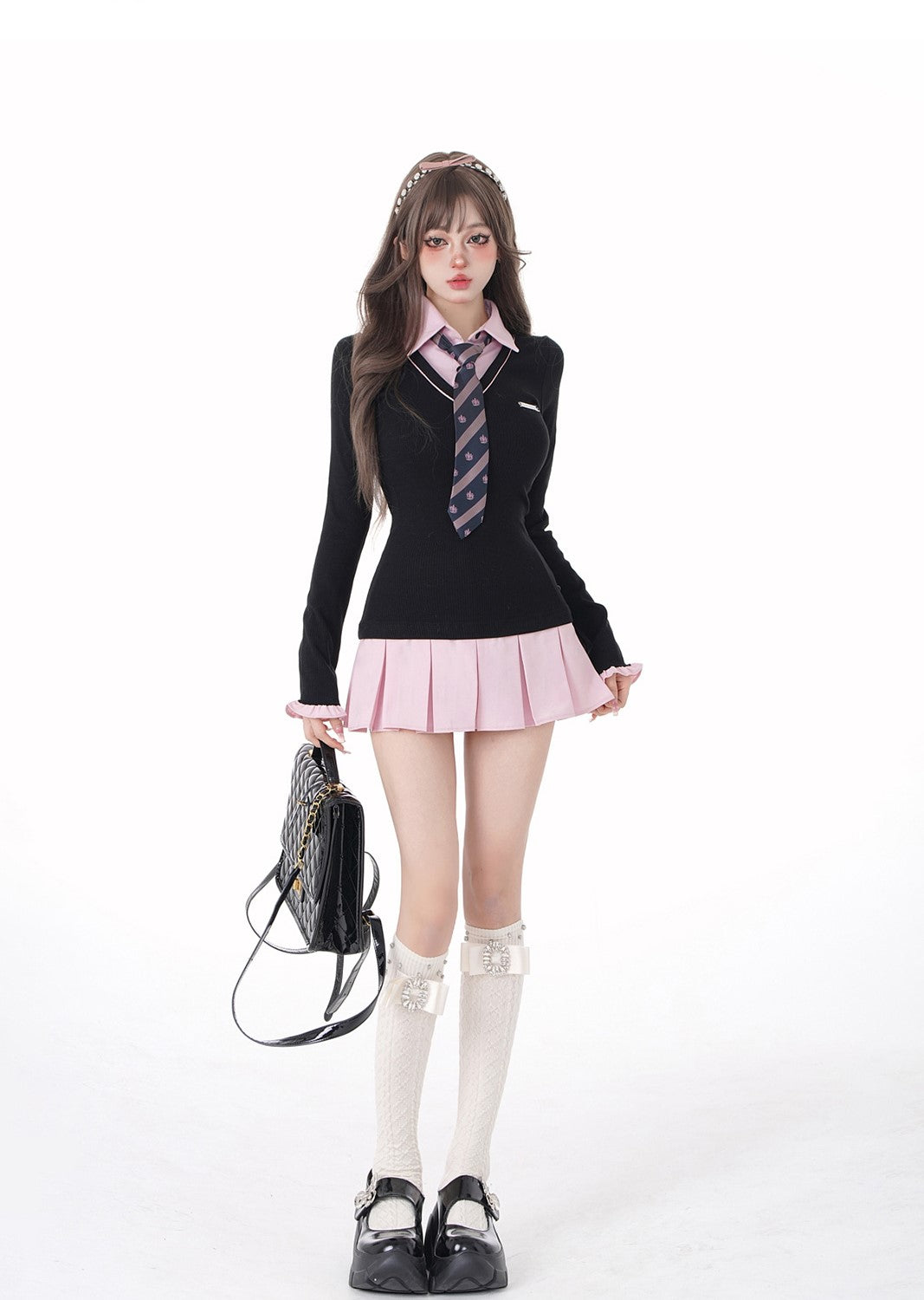 Young Eyes Academia High School Girl Black Pink Polo Collar Dress