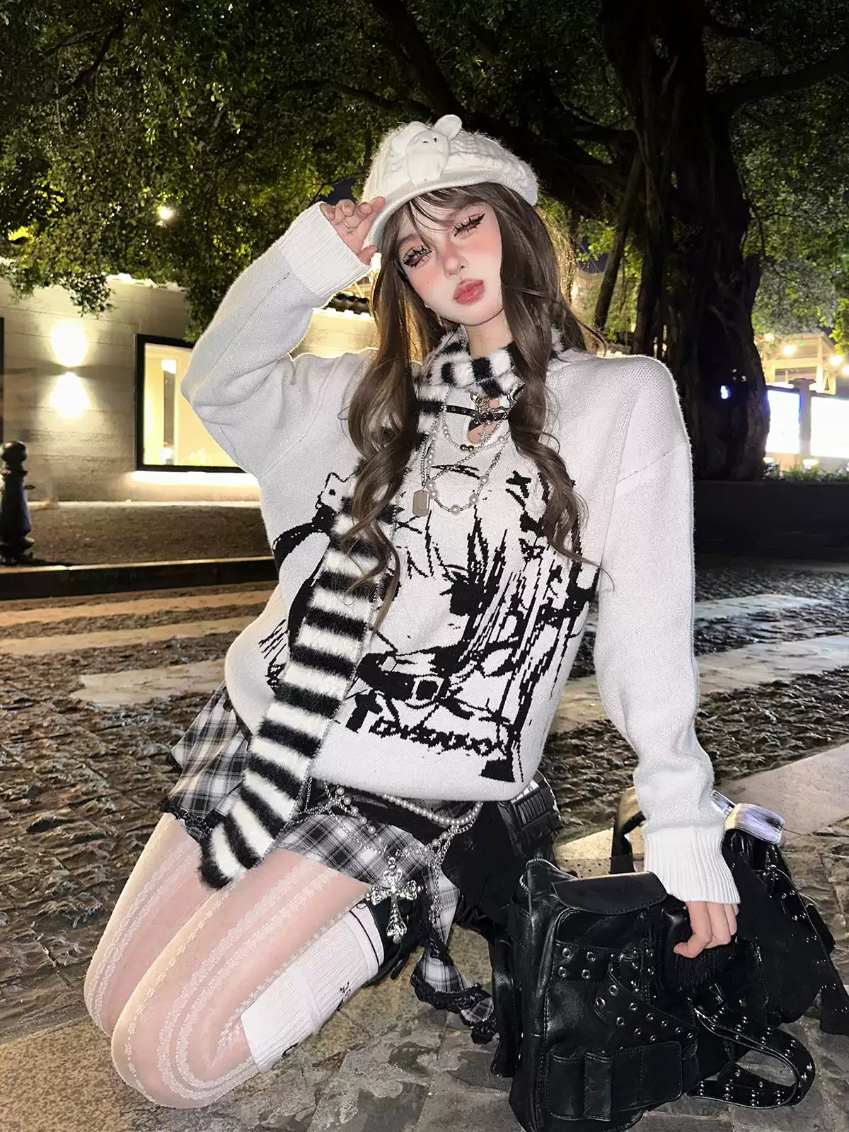 Young Eyes Anime Stimulation White Black Sweater Striped Scarf