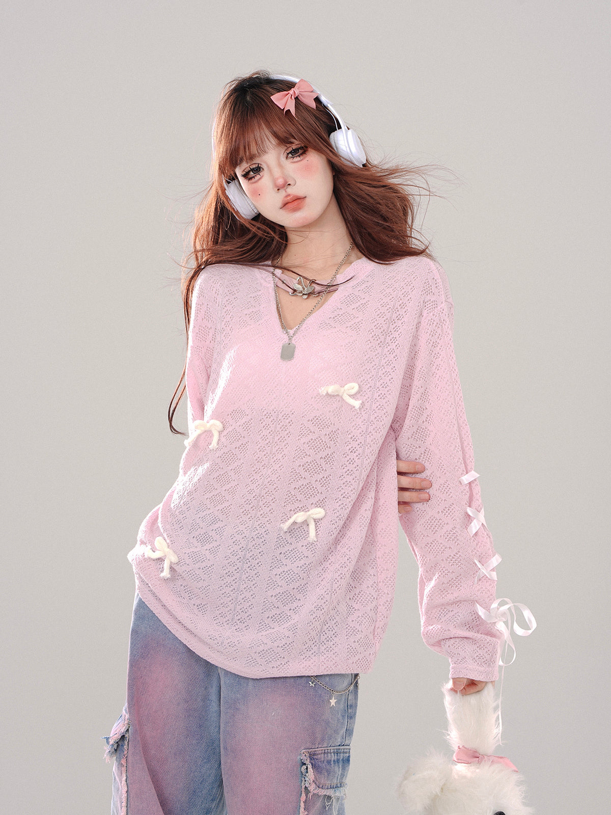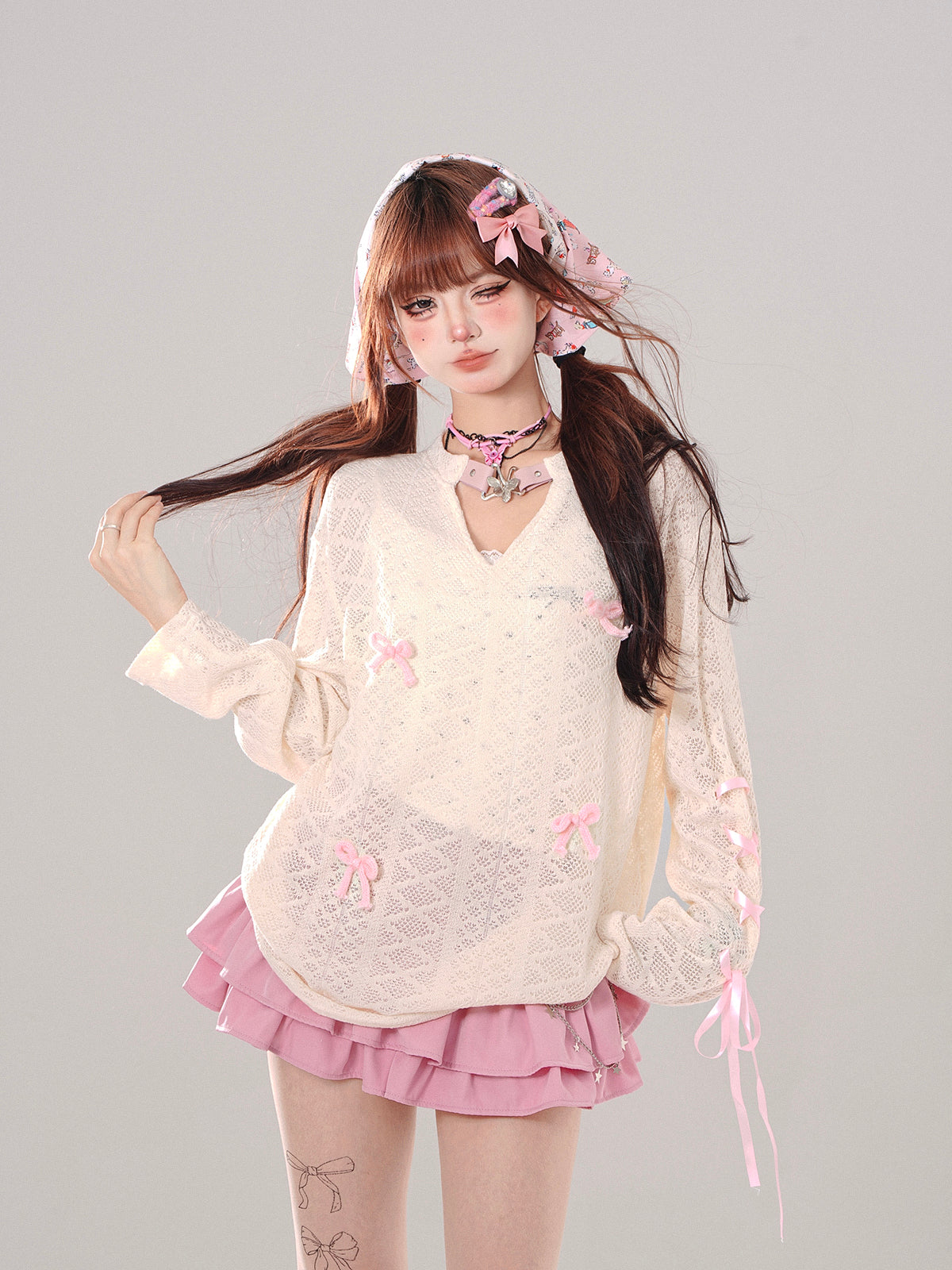 Young Eyes Apricot Bow Pink Cream See Through Knit Sweater Top