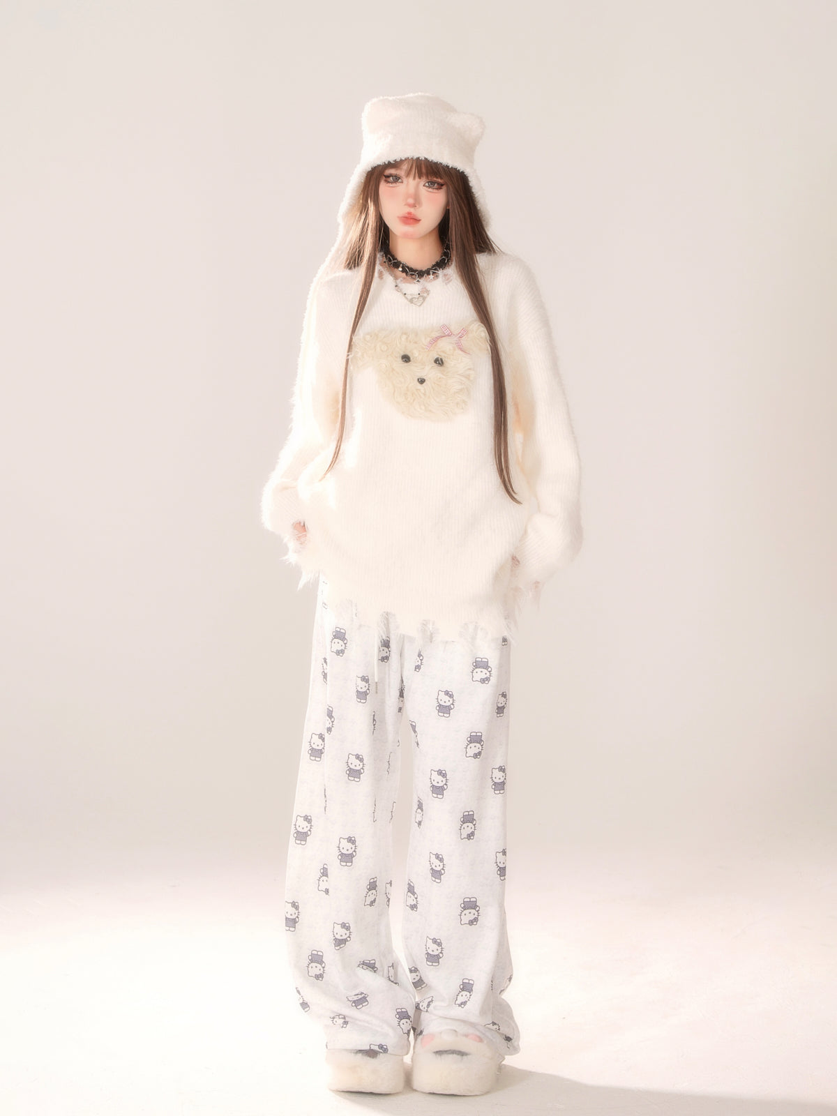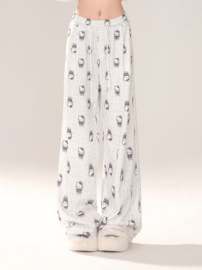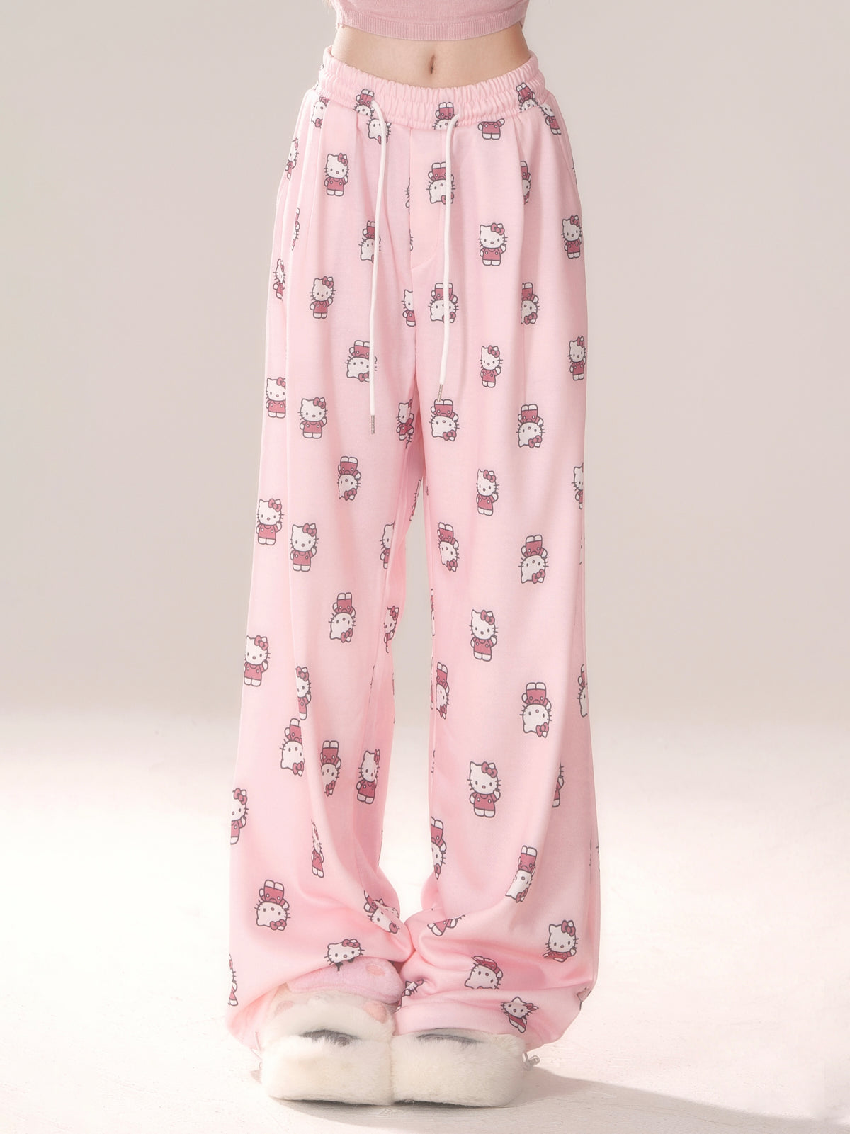 Young Eyes Y2K Kitty Cat Pink & White Elastic Gathered Waist Pants