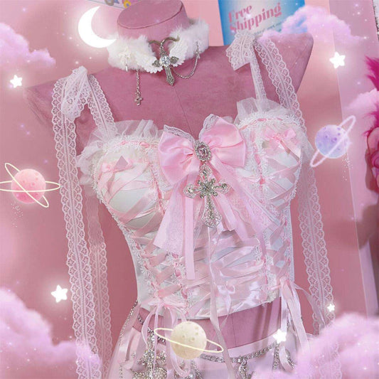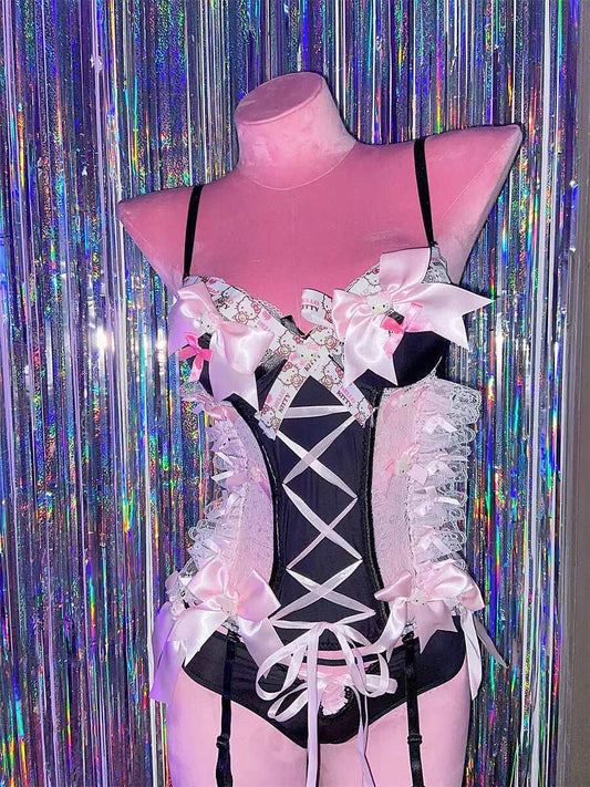 Coquette Sexy Y2K Bow Kitty Lace White Pink Black Camisole Bra Lingerie Skirt