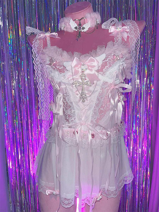 Coquette Sexy Bow Kitty Lace White x Pink Dress Lingerie