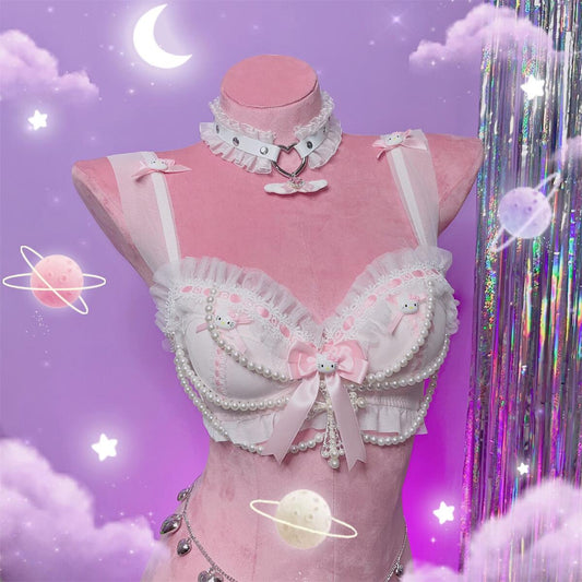 Coquette Sexy Y2K Bow Kitty Lace Pearl Pink Cream Bra Lingerie