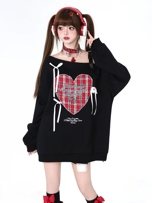 Crazy Girl Heart Plaid Black White Red Off Shoulder Sweater