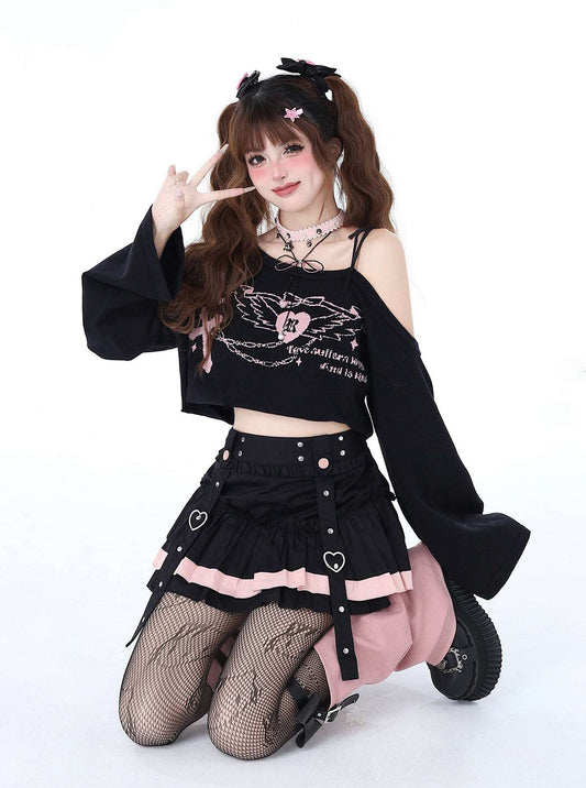 Crazy Girl First Love Concerto Heart Wings Y2K Pink Black Shirt Top