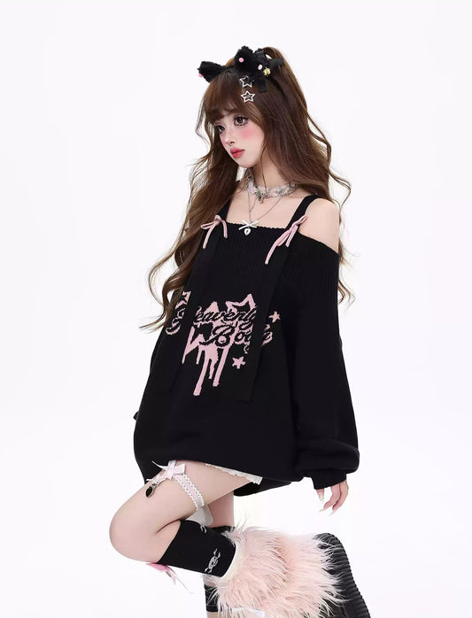 Crazy Girl Heavenly Body Star Black Pink Knit Off Shoulder Sweater