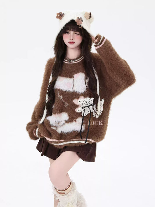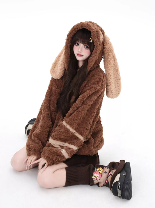 Crazy Girl Patchwork Brown Pink Rabbit Ears Jacket Hoodie