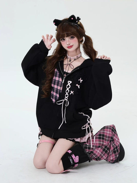Crazy Girl Plaid Lace Pink Black Jacket Hoodie