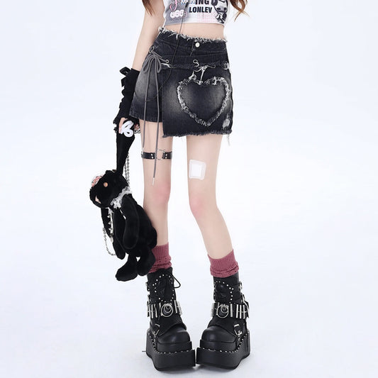 Crazy Girl Spicy Heart Y2K Pink Black Denim Short Skirt