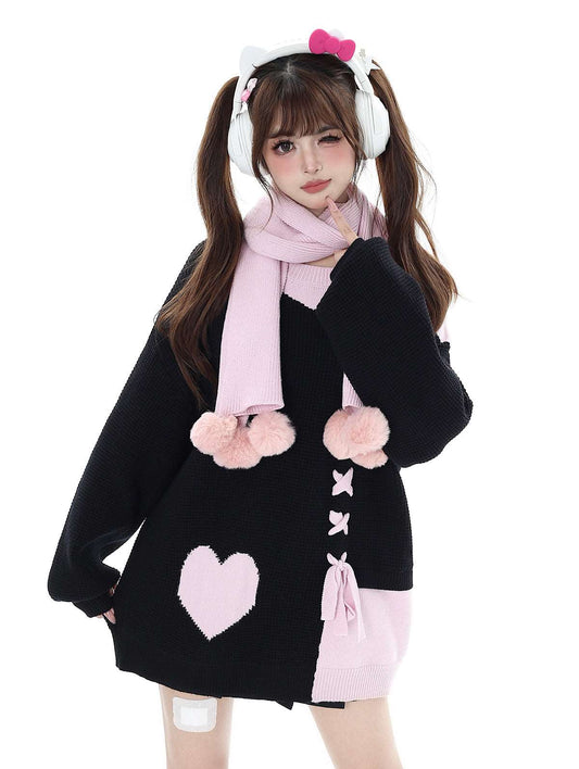 Crazy Girl Sweet Girl Knit Love Soft Pink Black With Scarf Sweater