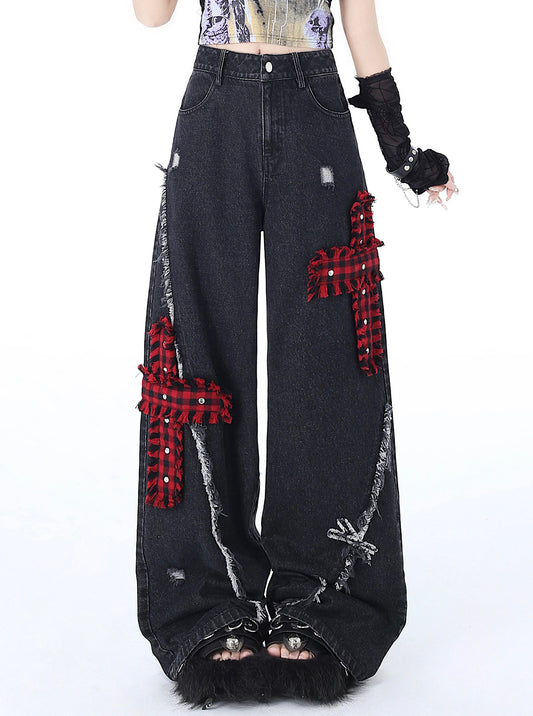 Crazy Girl Street Diary Red Plaid Cross Black Wide Leg Denim Jeans