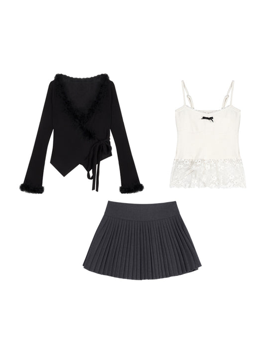 Creamy Cute Sweet Desire Black White Cami Cardigan Skirt Three Piece Set