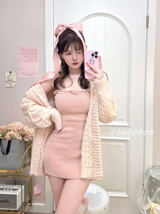 Creamy Cute Soft Girl Pink Knit Long Cardigan & Strap Dress Two Piece Set