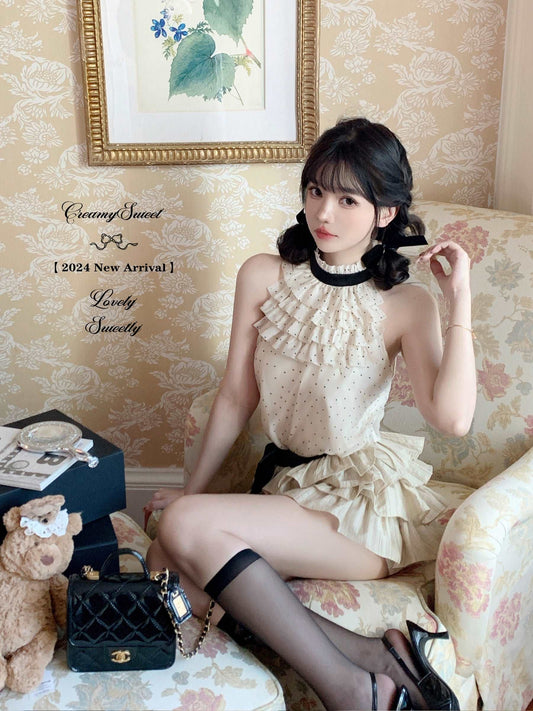 Creamy Cute Vanilla Polka Dot Chiffon Cream Black Sleeveless Top & Skirt Two Piece Set