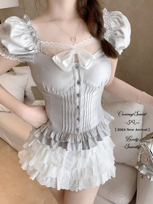 Creamy Cute Silver Gray Blouse & White Ruffle Skirt Two Piece Set