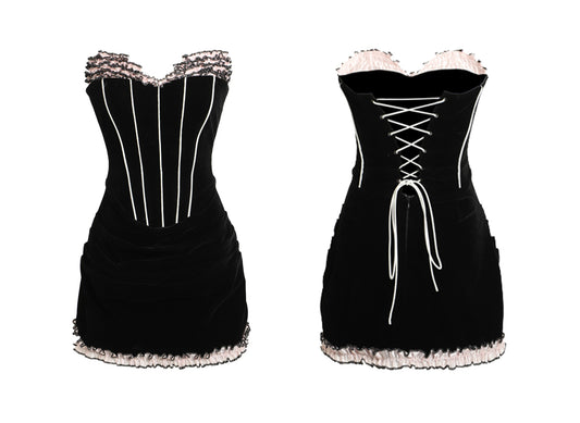 Creamy Cute Sexy Lace Black Pink Strapless Dress
