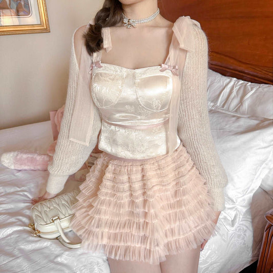 Creamy Cute Vintage White Camisole Pink Frill Mini Skirt Pink Cardigan Three Piece Set