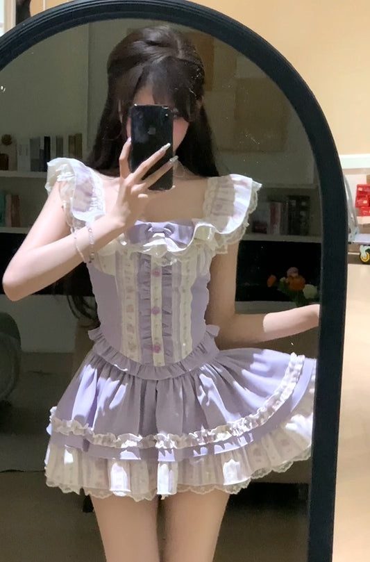 Creamy Cute Purple Puree Cream Top & Skirt Two Piece Set