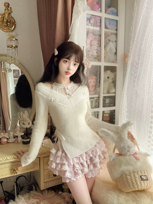 Early Winter Bonbon Pink Cream Sweater Top & Bloomers Two Piece Set