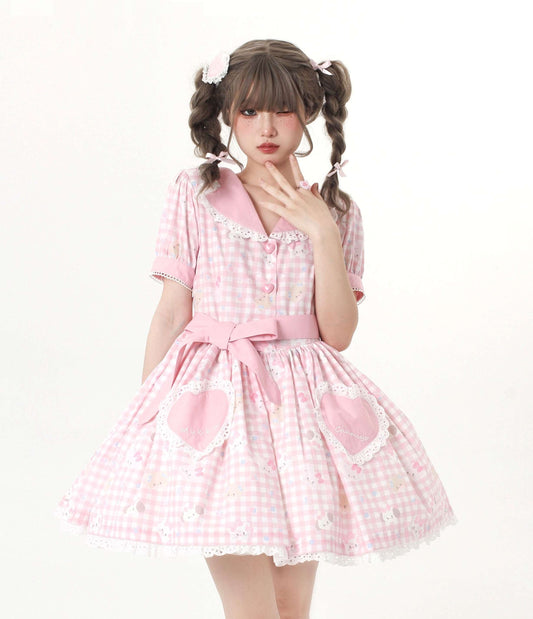EGL Cute Bear Cat Dog Pastel Pink Blue Checkerboard Short Sleeve Dress