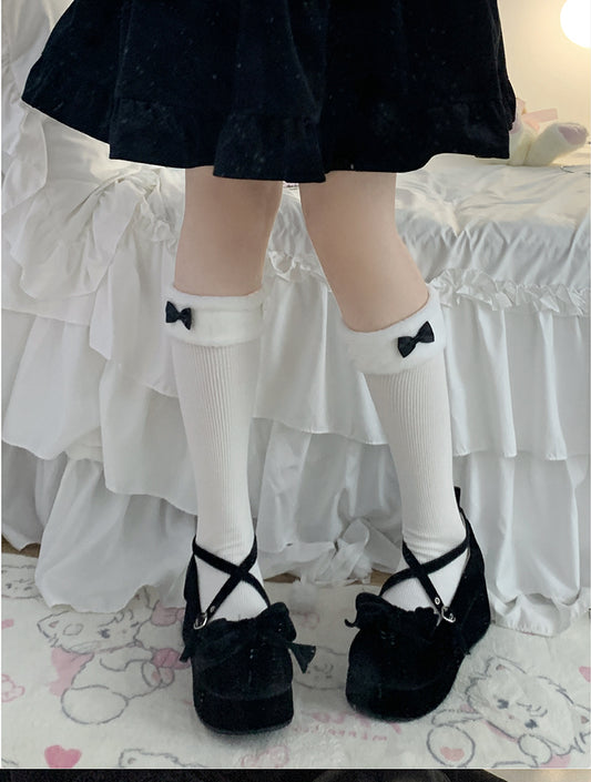 Lolita Cute Bow Fur Edge Black White Pink Mid Calf Socks
