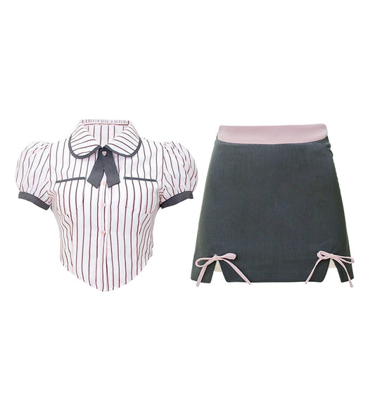 Serendipity College Girl Style Striped Pink Gray Shirt & Bow Mini Skirt Two Piece Set