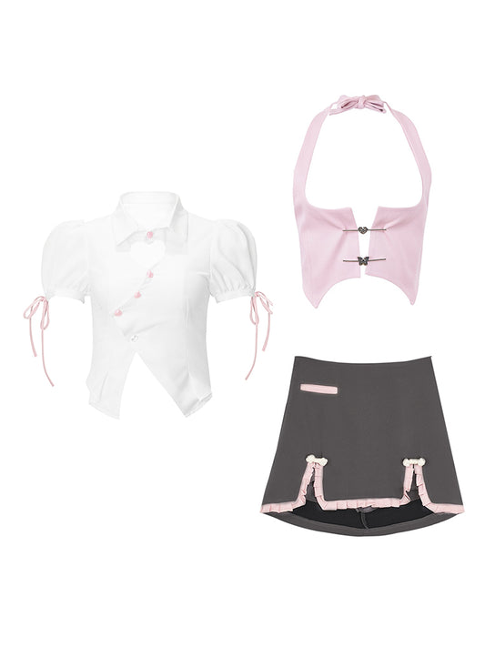 Serendipity Chinese Restaurant Waitress Pink Vest & White Shirt & Gray Mini Skirt Three Piece Set