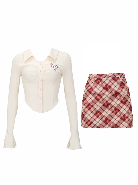 Serendipity Fall Beige Office Lady Long Sleeve T-Shirt & Red Plaid Mini Skirt Two Piece Set
