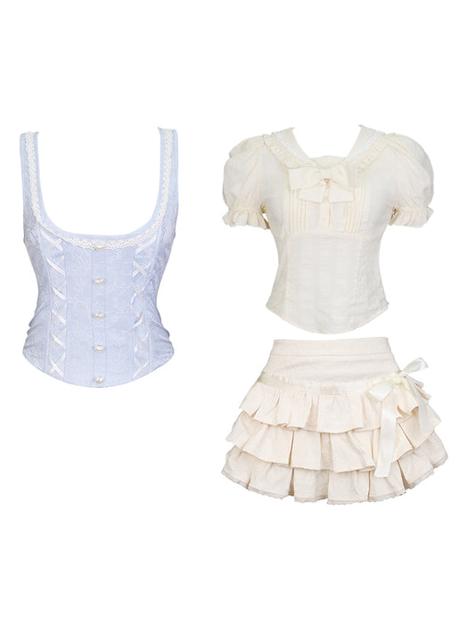 Serendipity Graven College Lace White Shirt & Blue Vest & Ruffle Skirt Three Piece Set