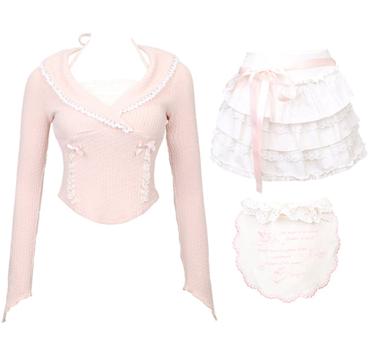 Serendipity Dessert Series Gray Sweater Top & Apron & Skirt Three Piece Set