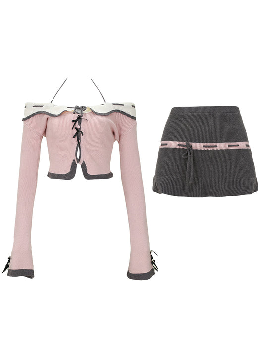 Serendipity Fall Mist Poetry Knit Pink Off Shoulder Sweater & Gray Skirt Two Piece Set