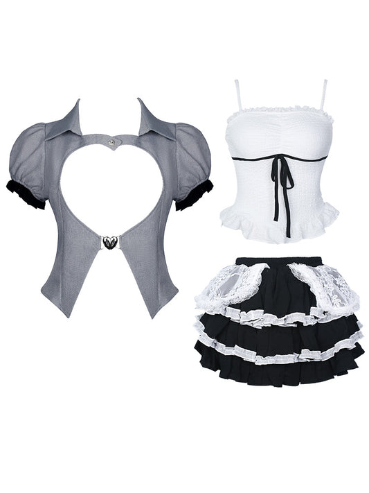 Serendipity Love Letter White Camisole & Gray Jacket & Black Skirt Three Piece Set