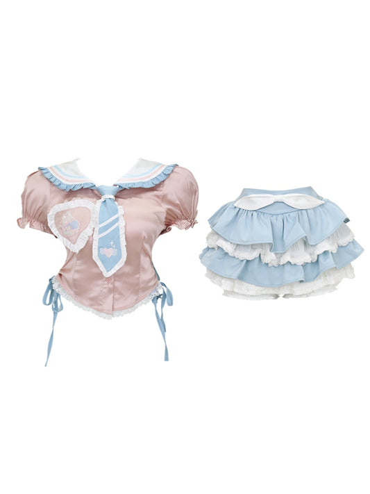Serendipity Heartbeat Gummy Pink Blue Seifuku Sailor Collar Shirt Top & Skirt Two Piece Set