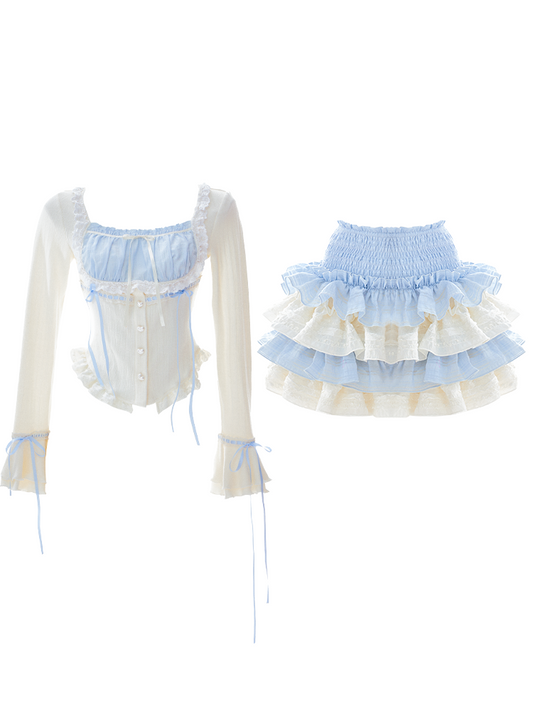 Serendipity Love Hime Lace Blue White Blouse Shirt & Ruffled Cake Skirt Two Piece Set
