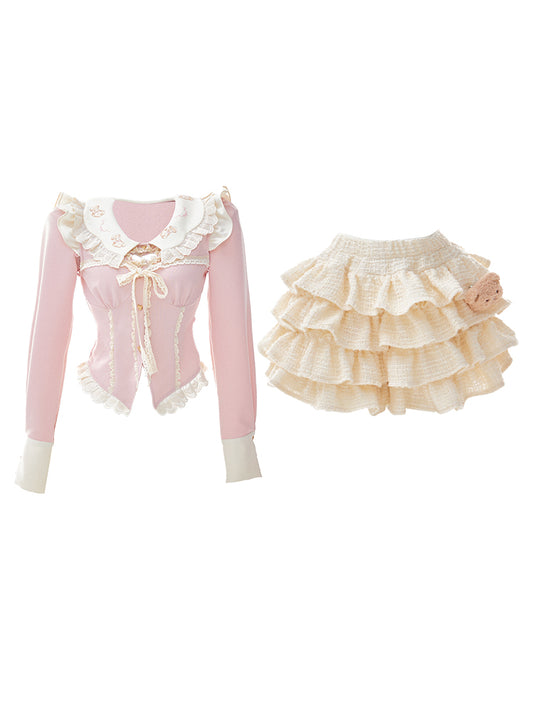 Serendipity Sweet Bear Pink Long Sleeve Shirt Suit Top & White Skirt Two Piece Set