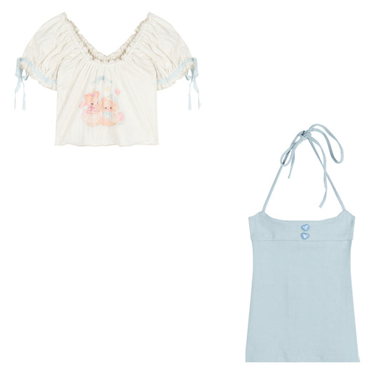 Serendipity Sweet Bear White Shirt Blouse Top & Blue Suspender Skirt Two Piece Set
