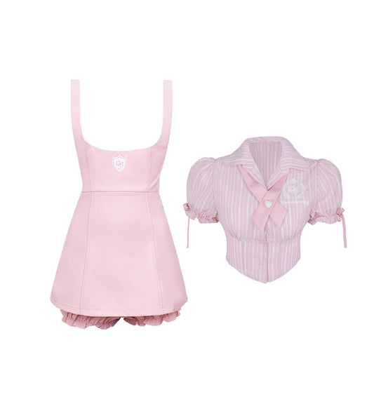 Serendipity Sweet Berry Pink Puff Sleeve Shirt Top & Suspender Skirt Two Piece Set