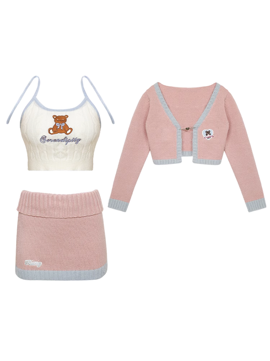 Serendipity Teddy Bear Camisole & Knit Pink Cardigan & Mini Skirt Three Piece Set