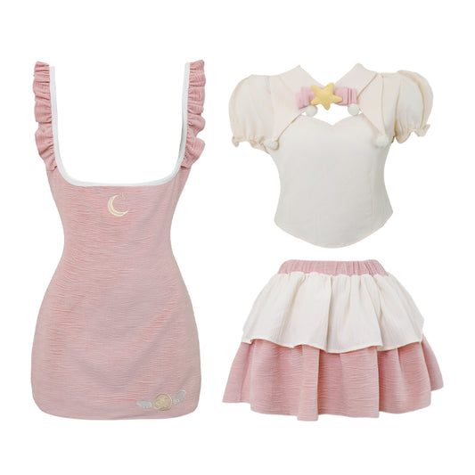 Serendipity Sweet Cream Rabbit Bear Camisole & Little Pink Jacket & Pink Mini Skirt Three Piece Set