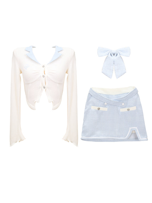 Serendipity Sweet Sexy Pastel Blue Bow White Shirt & Mini Skirt Two Piece Set